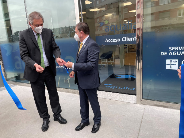 El alcalde de Oviedo, Alfredo Canteli, y el CEO de Aqualia, Félix Parra, junto con representantes institucionales y de la empresa concesionaria del agua en la ciudad, han inaugurado esta mañana las nuevas oficinas del Servicio Municipal de Aguas, ubicadas en el Gran Bulevar el Vasco.